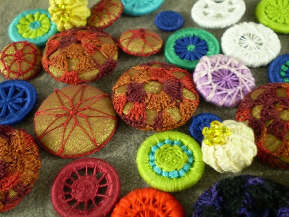 I am reviving centuries old button making techniques and rendering them with materials that are from my sister’s stash or locally available sources.