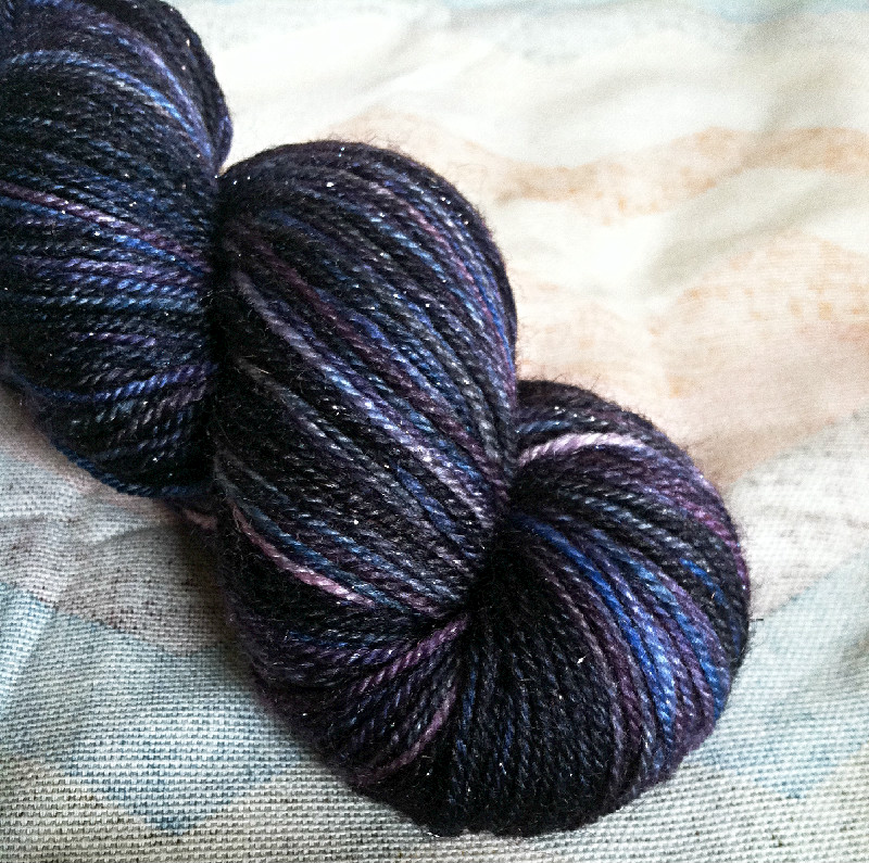 My current favorite is overdyeing yarns. I currently have a colorway that was inspired by new hair called Vibrato. It’s base is black, then overdyed sapphire blue and then overdyed purple. It is dyed on my favorite base which has merino, silk, nylon and metallic fibers.