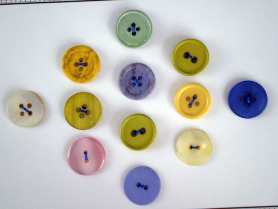 My hand dyed recycled buttons are salvaged from button collections of friends, or purchased at thrift shops and estate sales. These white or light colored buttons are carefully cleaned and sorted. Then they are dyed in a hot dye process and rinsed obsessively. They all take the dye a bit differently and no two are exactly the same. The colors are rich.