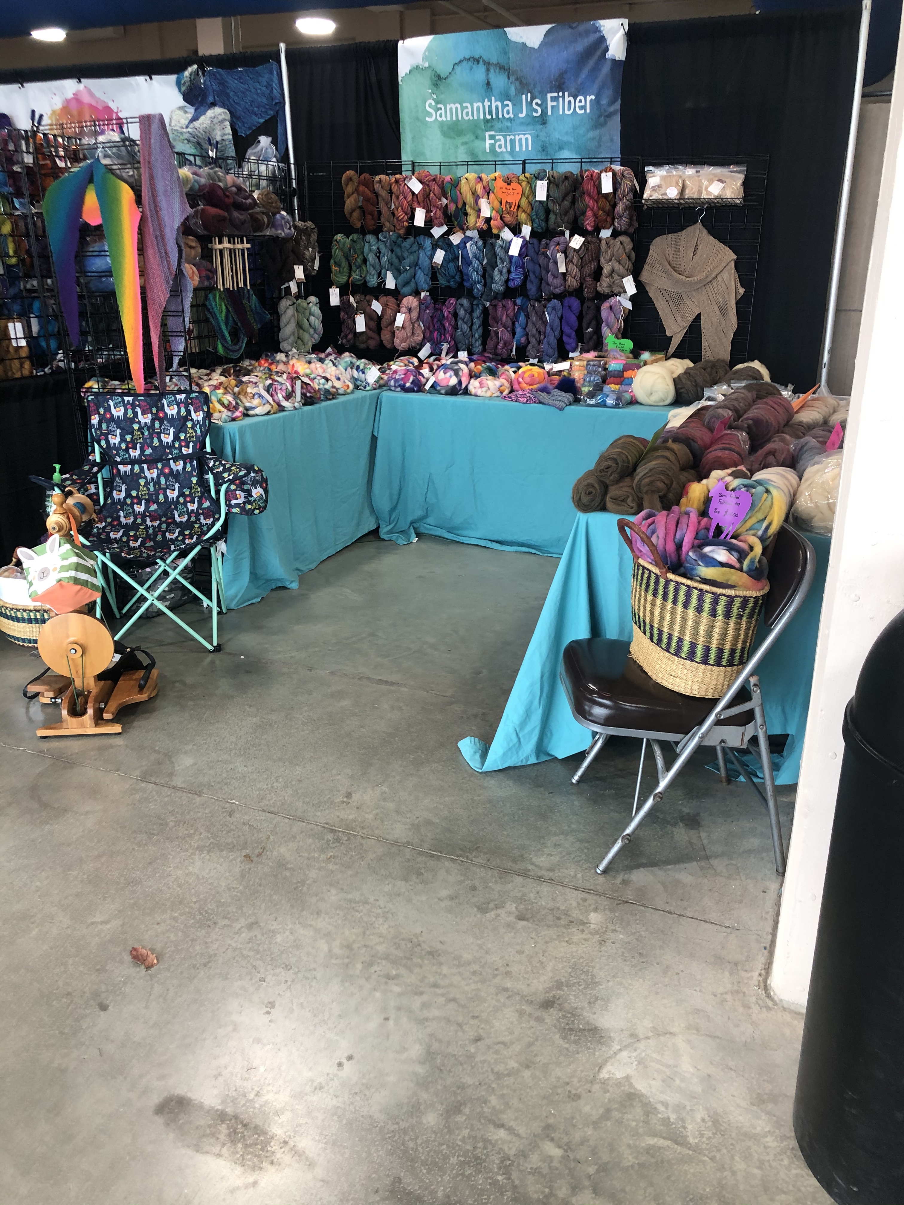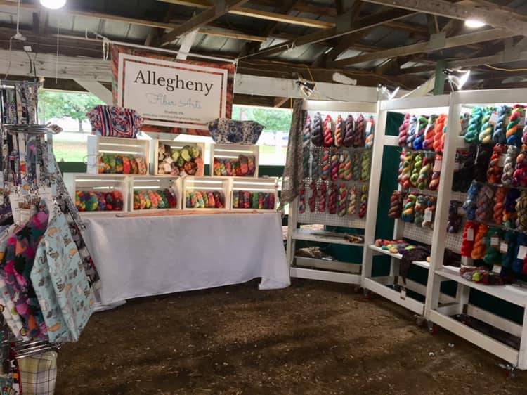 We sell hand-dyed fiber, handspun yarn, and finished products such as hats (Spin Me A Yarn). We also have handmade macrame products and succulents (Sustainable Stems), as well as shawl pins hand-turned from reclaimed wood (Sherpa’s Wood).
