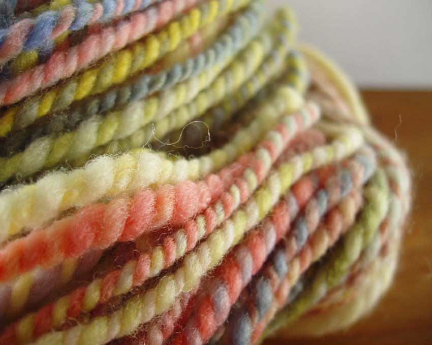 Rather than a specific item, I would say I really like my ever-changing collection of bulky yarns. They are quick, easy, and fun to create and work with. Plus they are so squishy and lofty. As far as colorways, I do not have repeatable recipes; however there are color combinations that I tend to gravitate towards. I love the way purple, orange, and red/pink interact. I like working with the “pie pieces” on the color wheel; those colors that are next to each other rather than opposite.