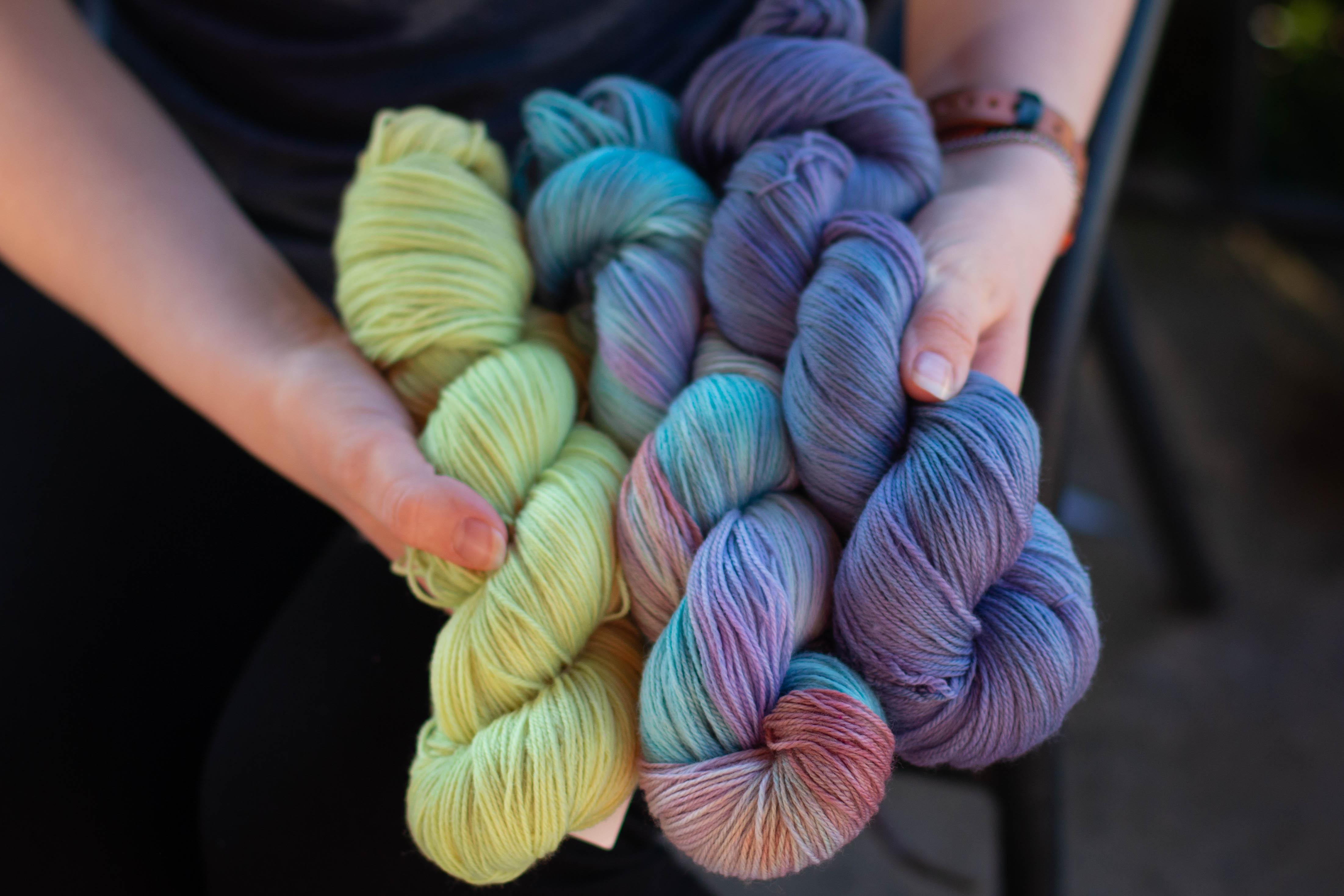 At SpaceCadet, we start with luxury fibers — merino wool, silk, linen, and bamboo — and then take the time to mix every dyebath by hand from primary colours, meaning every colourway is created using only five basic shades of dye, resulting in hand-dyed yarns and fiber that are a truly unique connection between the dyer and knitter or crocheter. We know it takes longer to dye this way, but it allows us and our customers to immerse ourselves in colour exploration in a way that is worth all the extra effort!
